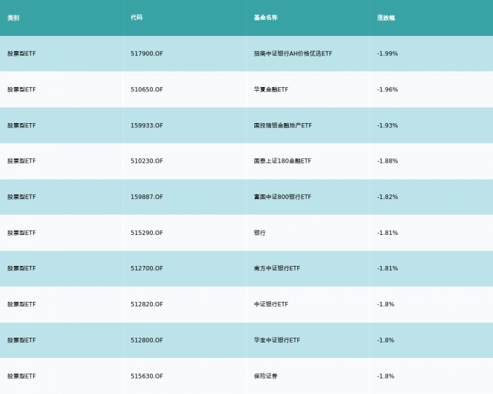 昨日股票型ETF跌幅最大的3支ETF及其收益率分别为:招商中证银行AH价格优选ETF(-1.99%)、华夏金融ETF(-1.96%)、国投瑞银金融地产ETF(-1.93%)。跌幅前10详情见下表: