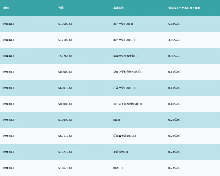 昨日股票型ETF资金流入最多的3支ETF及其流入金额分别为:南方中证500ETF(流入5.83亿元)、南方中证1000ETF(流入3.56亿元)、富国中证旅游主题ETF(流入0.86亿元)。资金流入前10详情见下表:
