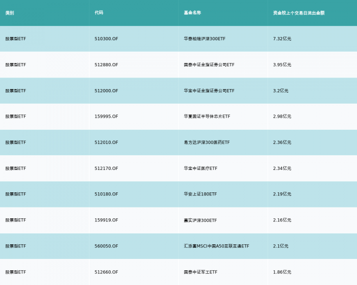 昨日股票型ETF资金流出最多的3支ETF及其流入金额分别为:华泰柏瑞沪深300ETF(流出7.32亿元)、国泰中证全指证券公司ETF(流出3.95亿元)、华宝中证全指证券公司ETF(流出3.2亿元)。资金流出前10详情见下表: