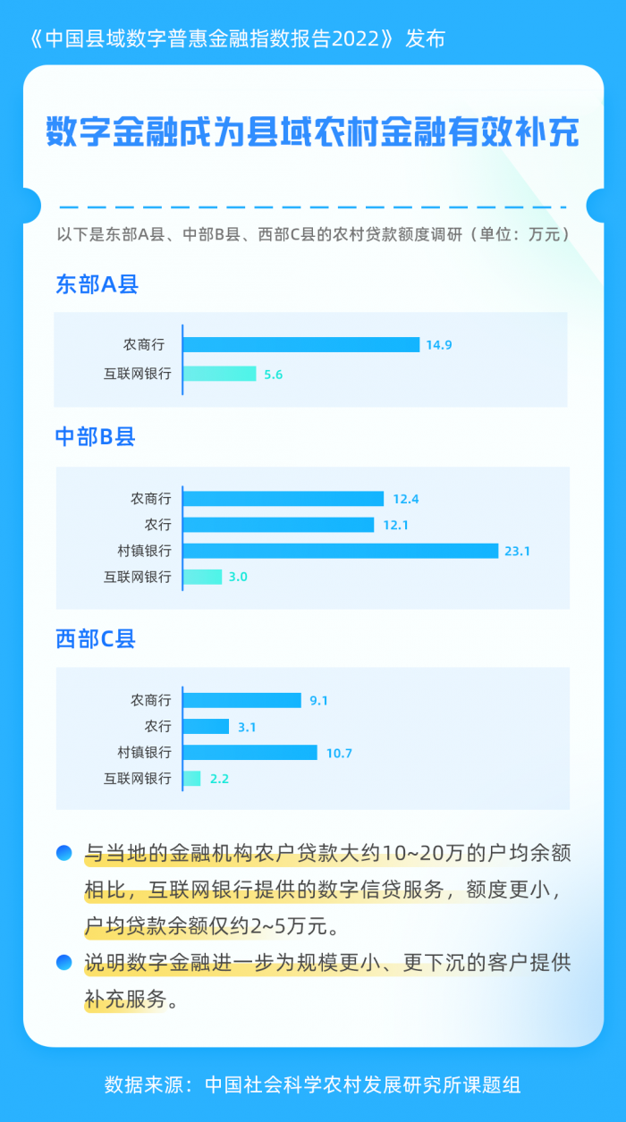 同时,社科院课题组也提出,有线上数据优势的科技银行与具有线下网点优势的传统金融机构合作,扩大发放县域数字贷款,有利于资金回流农村地区。