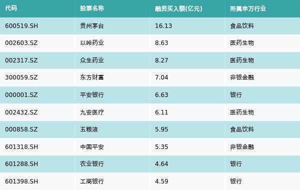 11月29日,两市共有3083只个股有融资资金买入,其中贵州茅台、以岭药业、众生药业排名前三,买入金额分别16.13亿元、8.63亿元、8.27亿元。融资买入额前10个股详情见下表: