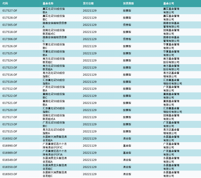 11月29日,有24只新基金发行,分别为:嘉实北证50成份指数A、嘉实北证50成份指数C、国寿安保超短债债券A、招商北证50成份指数发起式C、国寿安保超短债债券C、华夏北证50成份指数C、华夏北证50成份指数A、南方北证50成份指数发起C、南方北证50成份指数发起A、易方达北证50成份指数C、汇添富北证50成份指数A、广发北证50成份指数A、富国北证50成份指数C、富国北证50成份指数A、汇添富北证50成份指数C、招商北证50成份指数发起式A、广发北证50成份指数C、易方达北证50成份指数A、永赢新兴消费智选混合发起A、广发富信优选六个月持有混合(FOF)C、广发富信优选六个月持有混合(FOF)A、永赢消费龙头智选混合发起A、永赢消费龙头智选混合发起C、永赢新兴消费智选混合发起C,详情见下表: