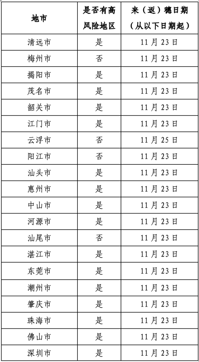 以下地区、时间段的来(返)穗人员,及所有穗康码“红码”和“黄码”人员请跟所在社区(村)、单位、酒店主动报备,或者通过穗康码小程序来(返)穗申报功能主动申报,接受社区相应的健康管理。