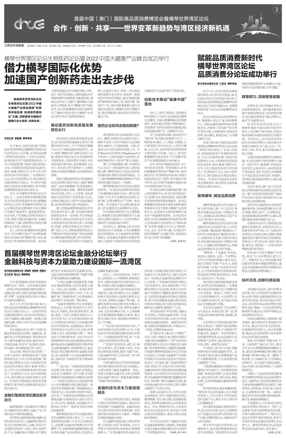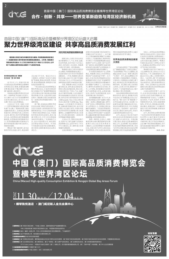 围绕大湾区高质量发展、高品质消费新生态和“科技-产业-金融”高水平循环等话题,南方财经全媒体集团聚焦首届中国(澳门)国际高品质消费博览会暨横琴世界湾区论坛系列活动,推出生物医药分论坛、品质消费分论坛、金融分论坛等,广邀国际政要、金融机构负责人、世界湾区代表以及知名企业家、银行家、经济学家等重磅嘉宾,把脉前沿趋势与湾区发展新动能。