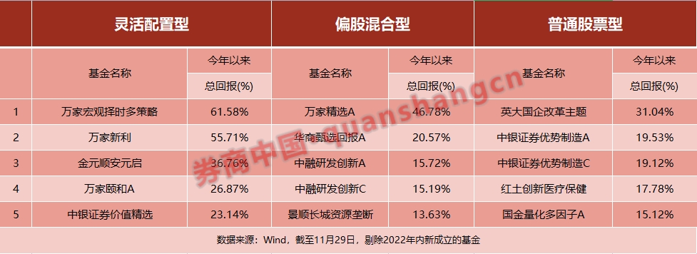 偏股混合型基金中,目前暂列第一的是黄海在管万家精选A。此外,周海栋在管的华商甄选回报A、金拓在管的中融研发创新等排名也相对靠前。普通股票型基金中,张媛、汤戈在管的英大国企改革主题,白冰洋在管的中银证券优势制造A,盖俊龙、廖星昊在管的红土创新医疗保健等都有不错表现。