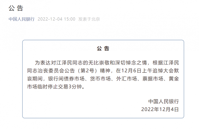 为表达对江泽民同志的无比崇敬和深切悼念之情,根据江泽民同志治丧委员会公告(第2号)精神,在12月6日上午追悼大会默哀期间,银行间债券市场、货币市场、外汇市场、票据市场、黄金市场临时停止交易3分钟。