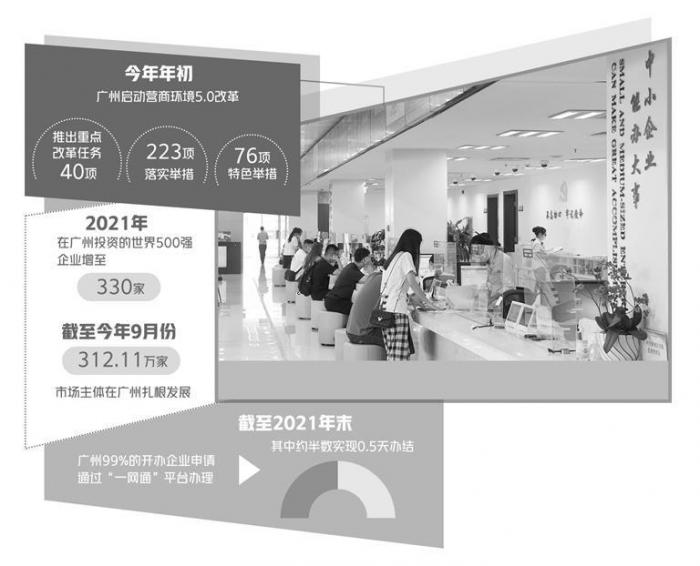 2018年以来,广州迭代实施营商环境改革,从聚焦行政审批“简政放权”的1.0改革,到瞄准重点领域“指标攻坚”的2.0改革、着眼行政审批跨部门“流程再造”的3.0改革、以“绣花功夫”提升管理服务水平的4.0改革,再到如今以“激发活力”为主线的5.0改革,全力建设全球企业投资首选地和最佳发展地。2021年,在穗投资的世界500强企业增至330家。截至今年9月份,312.11万家市场主体在广州扎根发展。