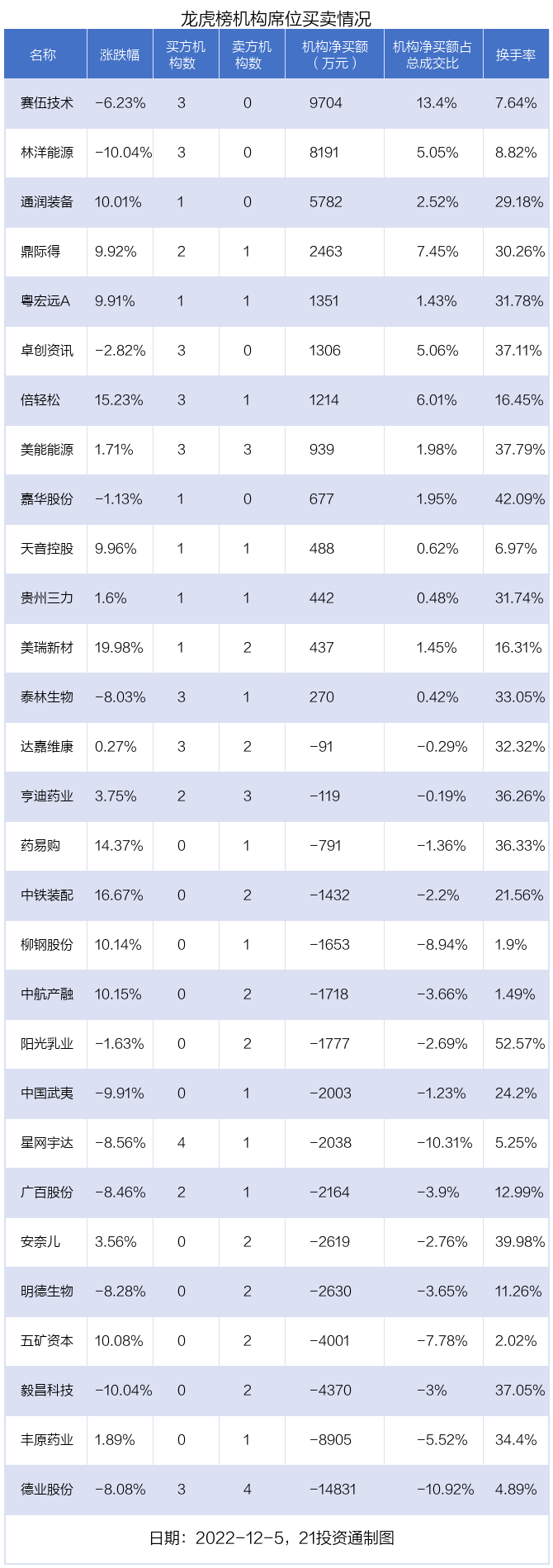 其中,机构净买入金额最多的是赛伍技术(603212.SH),当日收盘下跌6.23%,换手率为7.64%。