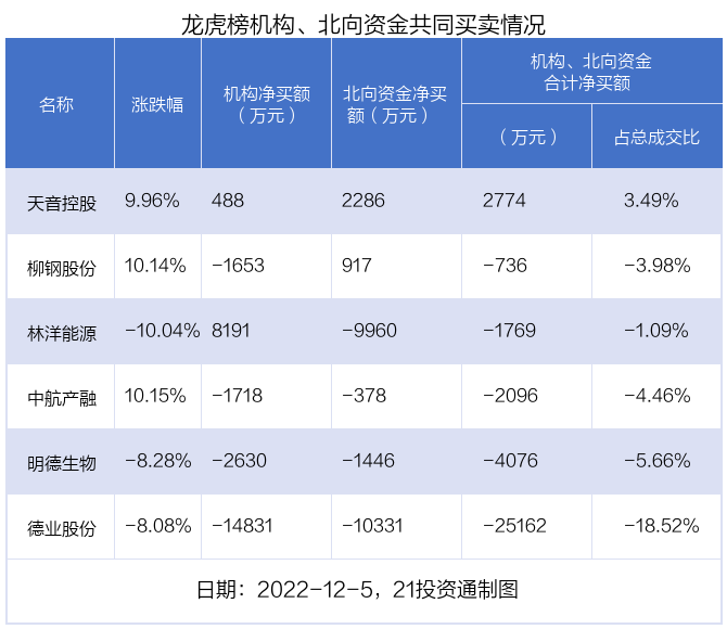 值得注意的是,机构和北向资金共同净买入了天音控股;共同净卖出了中航产融、明德生物、德业股份等3股;在柳钢股份,林洋能源上出现分歧,机构净卖出柳钢股份1653.06万元,北向资金净买入916.99万元;机构净买入林洋能源8190.79万元,北向资金净卖出9960.27万元。