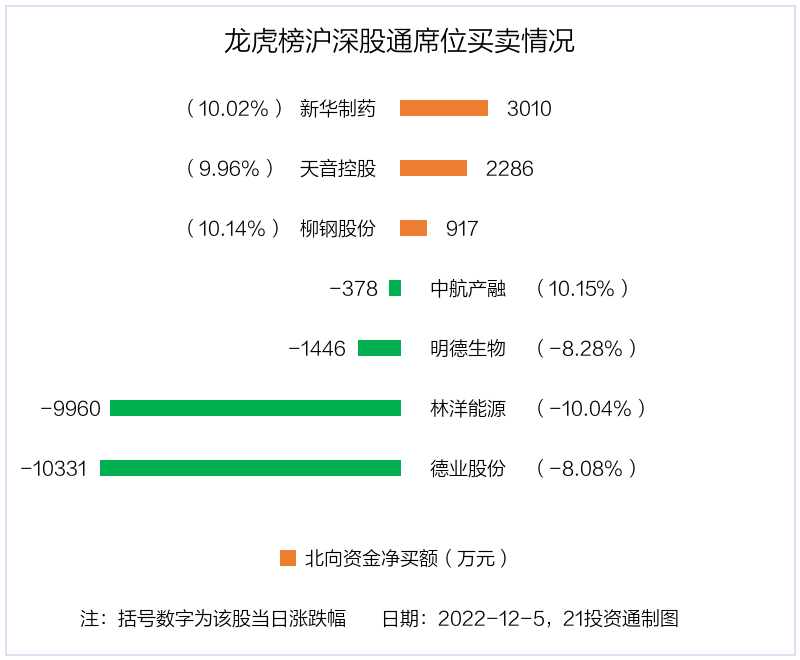 12月5日,北向资金参与龙虎榜中的个股共有7只,合计净卖出1.59亿元。其中沪股通净买入1股,净卖出3股,合计净卖出1.98亿元;深股通净买入2股,净卖出1股,合计净买入3849.37万元。