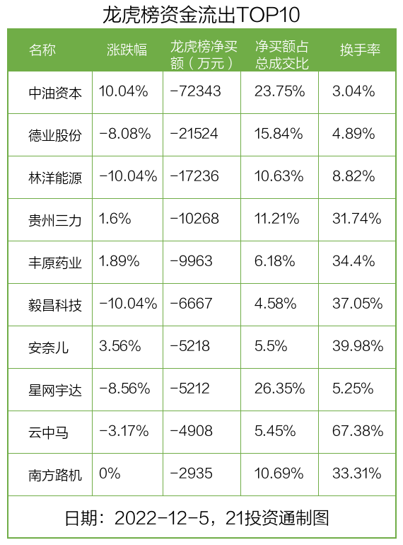 而龙虎榜中资金净流出最多的是中油资本(000617.SZ),被净卖出为7.23亿元,占总成交金额的23.75%。中油资本收盘上涨10.04%,换手率为3.04%。