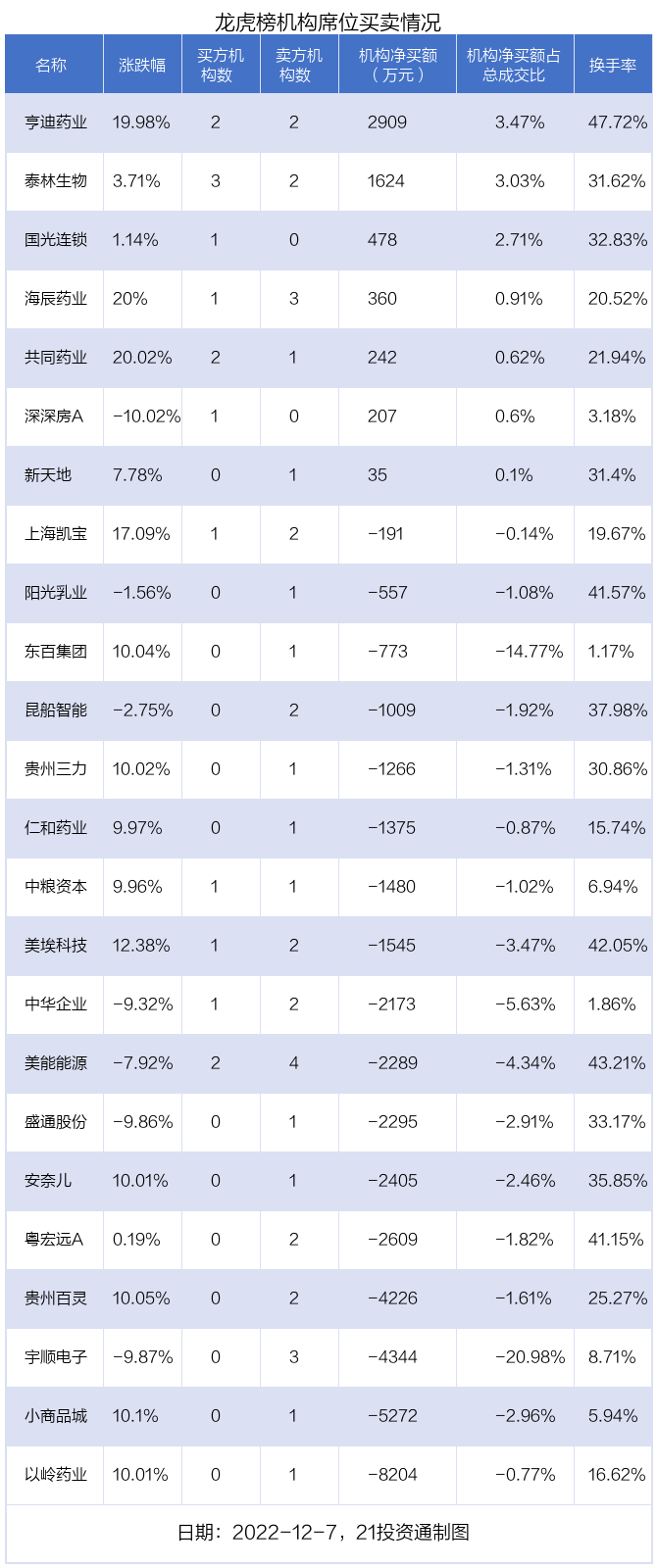 12月7日,24只个股龙虎榜出现了机构的身影,机构合计净卖出3.62亿元。具体来看,机构净买入7股,净卖出17股。