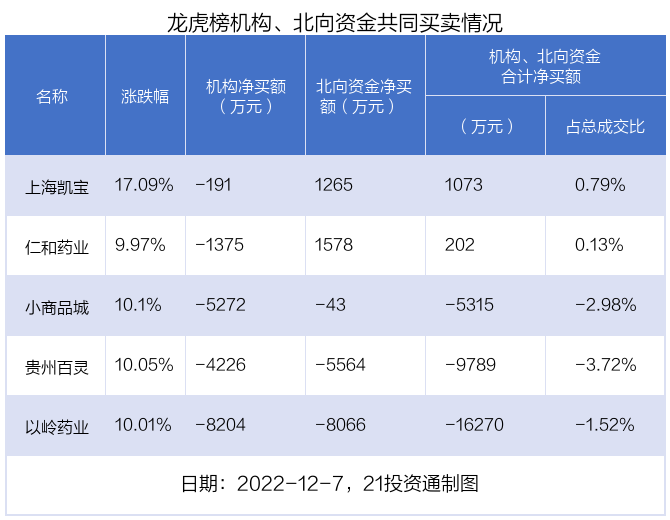 值得注意的是,机构和北向资金共同净卖出了小商品城、贵州百灵、以岭药业等3股;在仁和药业,上海凯宝上出现分歧,机构净卖出仁和药业1375.4万元,北向资金净买入1577.53万元;机构净卖出上海凯宝191.32万元,北向资金净买入1264.65万元。