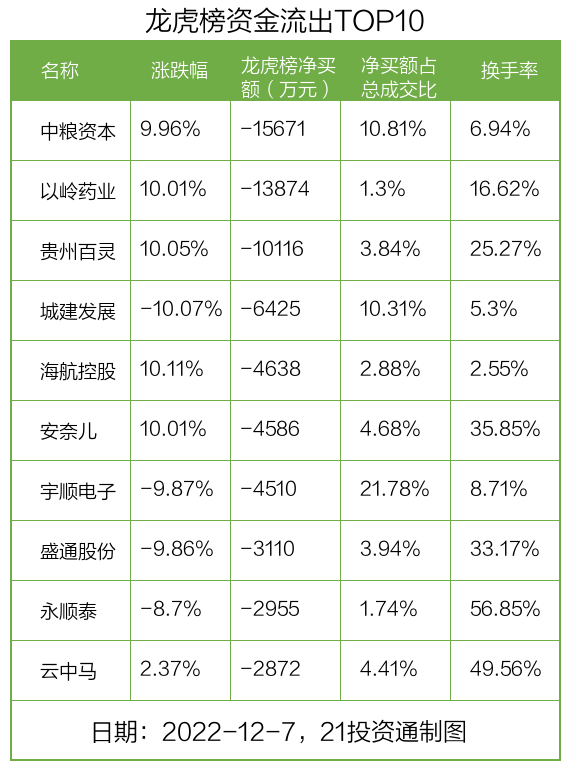而龙虎榜中资金净流出最多的是中粮资本(002423.SZ),被净卖出为1.57亿元,占总成交金额的10.81%。中粮资本收盘上涨9.96%,换手率为6.94%。