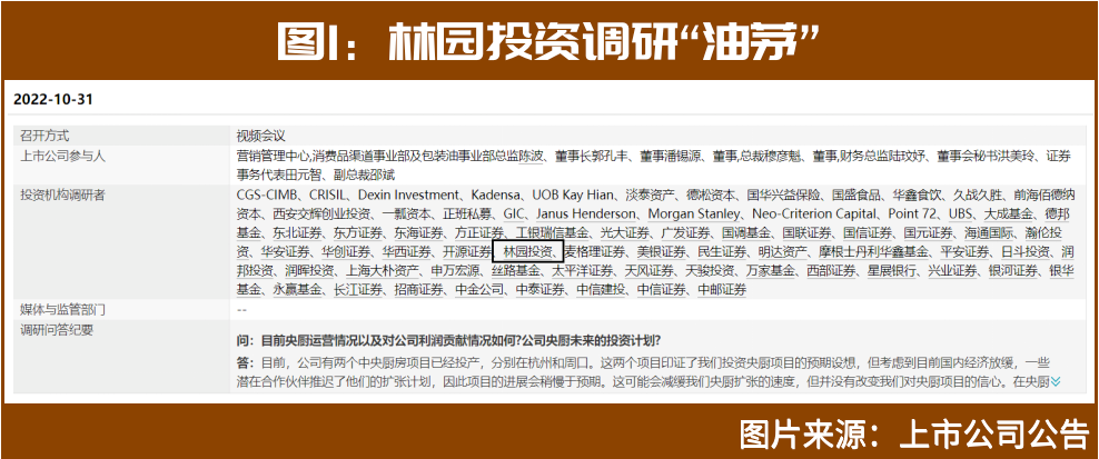 作为食品饮料细分赛道之一的粮油板块也在近期迎来了复苏。11月以来,“油茅”股价累计上涨达10%,而巧合的是,这正是在林园对其调研“造访”以来的表现。