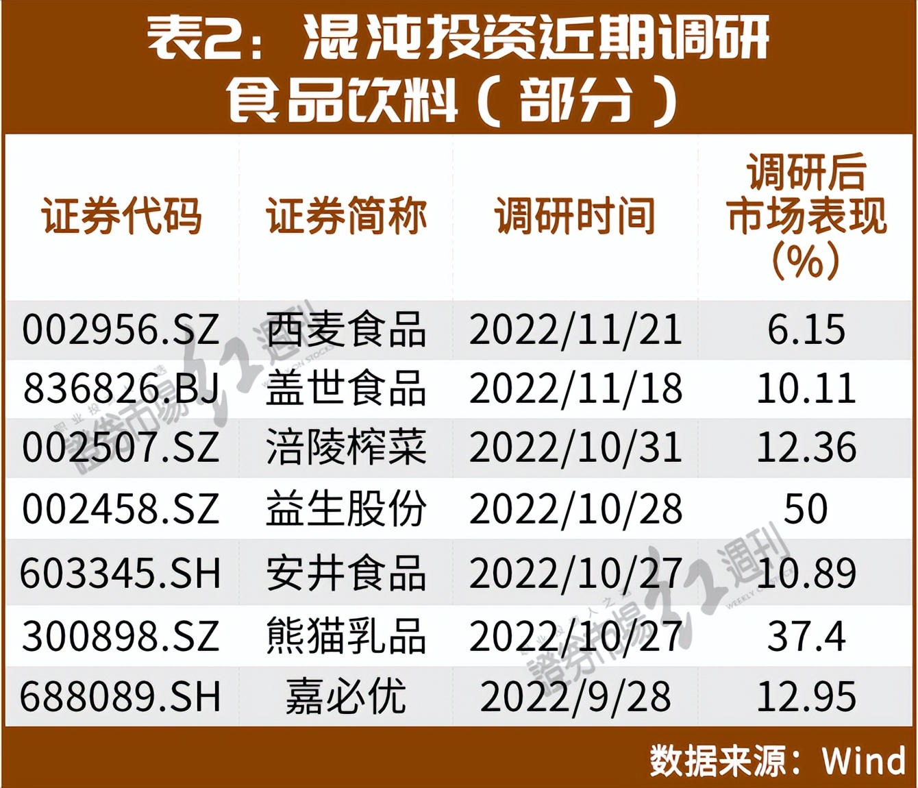 从历史持仓来看,葛卫东对芯片等硬科技股十分偏爱,近年以来也在加码新能源,但其持仓名单中却很少出现食品饮料公司。而近期,混沌投资却频频调研食品饮料股,如西麦食品、涪陵榨菜等,而被调研公司多数在此后迎来上涨,主营为肉制品的益生股份,在混沌投资10月28日调研以来上涨达50%(见表2)。