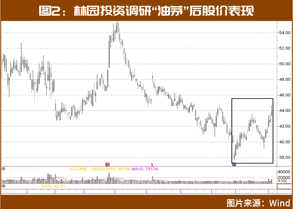 曾在10月31日“油茅”的一项机构调研活动中,“久未露面”的林园投资“突然现身”。自此之后,“油茅”股价出现了触底反弹(见图1、图2)。