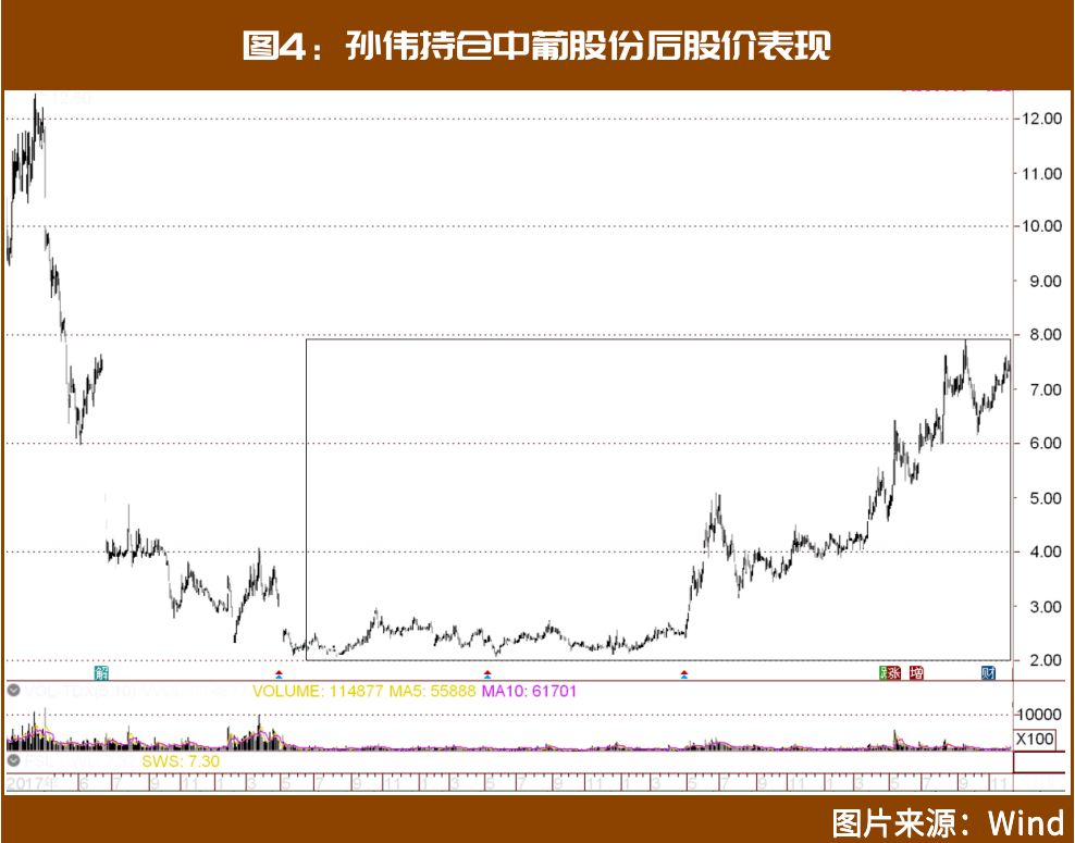 将时间周期拉长来看,不得不说,孙伟对于中葡股份的操盘是比较精准的。除了在举牌后继续迎来上涨,在2019年二季度孙伟新进布局的时点,中葡股份也正巧处于股价的“洼地”(见图4)。