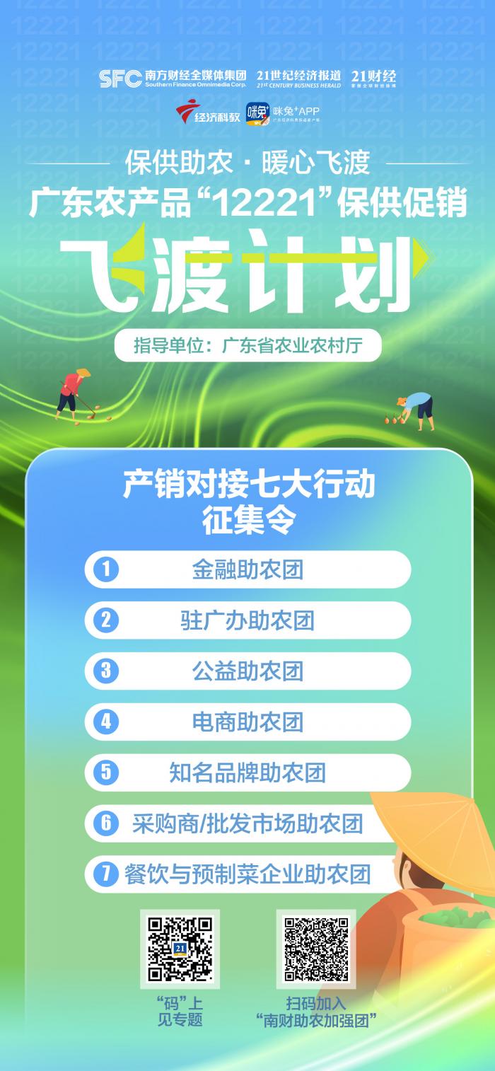 为推动“飞渡计划”顺利实施,聚力破解农产品流通和农业发展关键问题,南方财经全媒体集团现向社会各界发出征集动员,诚挚邀请金融机构、各地驻广办、电商平台、公益机构、农产品采购商及批发企业、餐饮及预制菜企业参与该计划,携手组建助农团、开展产销对接,共同在广东省农业农村厅的指导下,创新优化农产品“12221”市场体系建设。