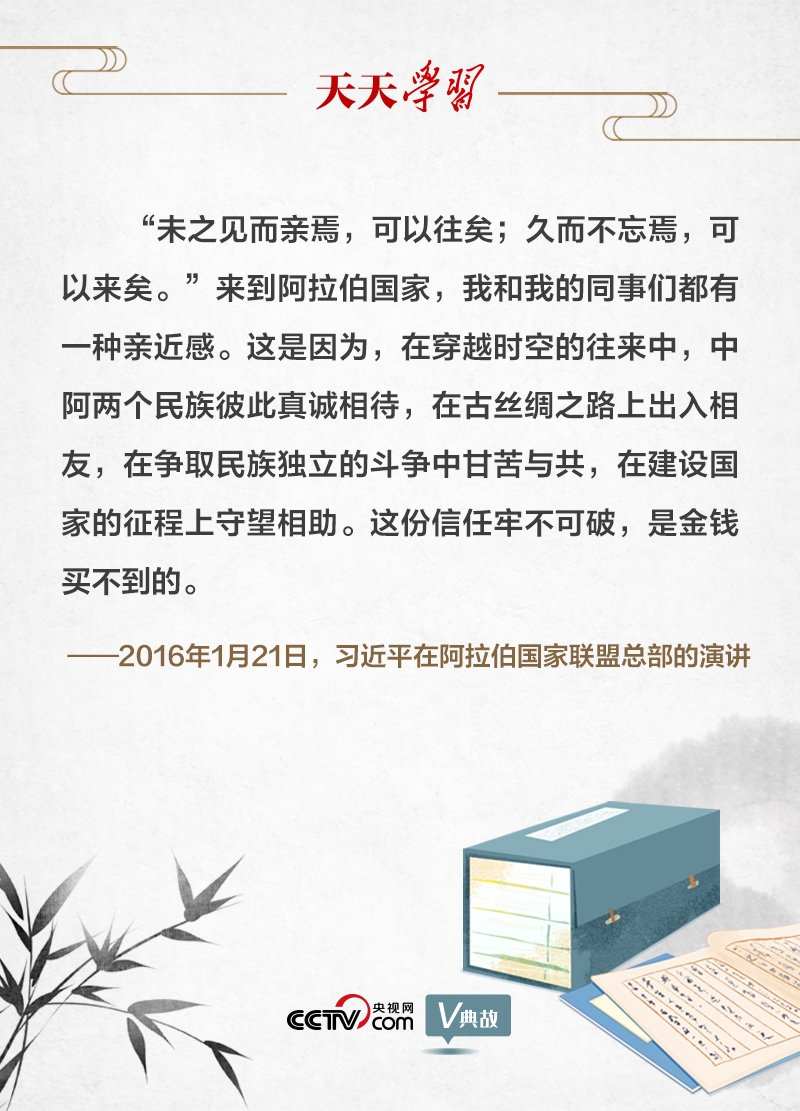 习近平主席在阿拉伯国家联盟总部发表演讲时引用这句古语,舍弃其历史语境下的特殊含义,将旧时君主与民众的关系引申为当今国与国之间、民族与民族之间的关系,从而赋予原典以新的内涵。“未之见而亲焉”,没见面就产生了亲近感,这里指超越空间;“久而不忘焉”,时间再久也不会忘怀,这里指超越时间。超越了时空的友谊,就可以使国家之间、民族之间的关系更加融洽。习主席藉此表达了中国人民和阿拉伯人民穿越时空的传统友谊。