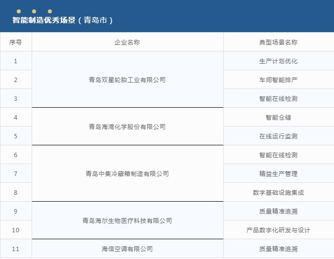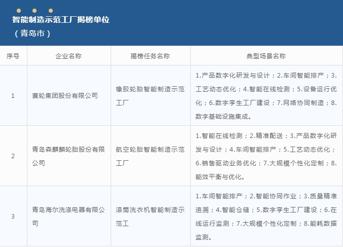 日前,工业和信息化部公示了2022年度智能制造示范工厂揭榜单位和优秀场景名单,青岛市8家企业入选。其中,示范工厂揭榜单位3家,优秀场景5家。名单如下: