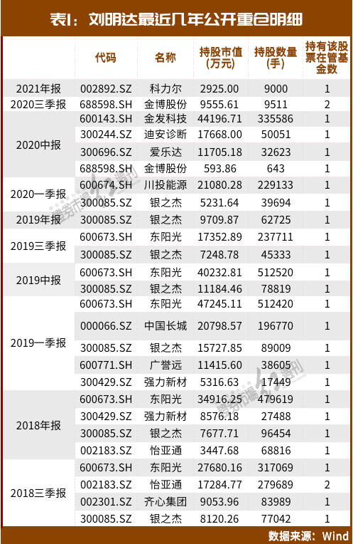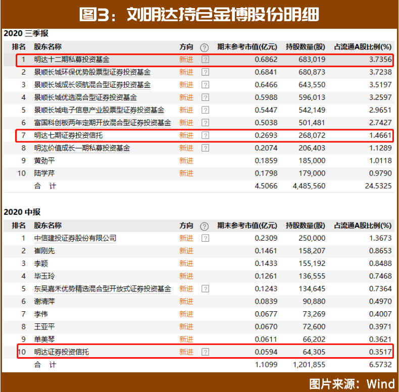 据了解,金博股份是一家主营先进碳基复合材料并于2020年5月18日登陆科创板的企业,在金博股份上市后首次披露的2020年中报中,刘明达的代表作明达(明达证券投资信托)就成为了公司的第十大流通股股东。在2020年第三季度末,刘明达管理的明达12期和7期两只产品同时进入了金博股份的前十大流通股股东名单。