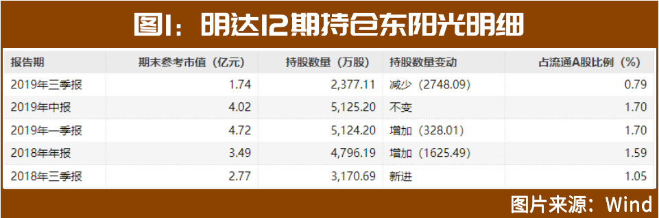 实际上,刘明达也曾重仓持有东阳光。当时是2018年第三季度,刘明达管理的明达12期首次进入了东阳光的前十大流通股股东名单,并且以3170.69万股的持股数量位居第六大流通股股东,此后更是连续两个季度不断加仓,明达12期也一度因此晋升为东阳光的第四大流通股股东。直至2019年四季度末,明达12期才退出东阳光的前十大流通股股东(见图1、2)。