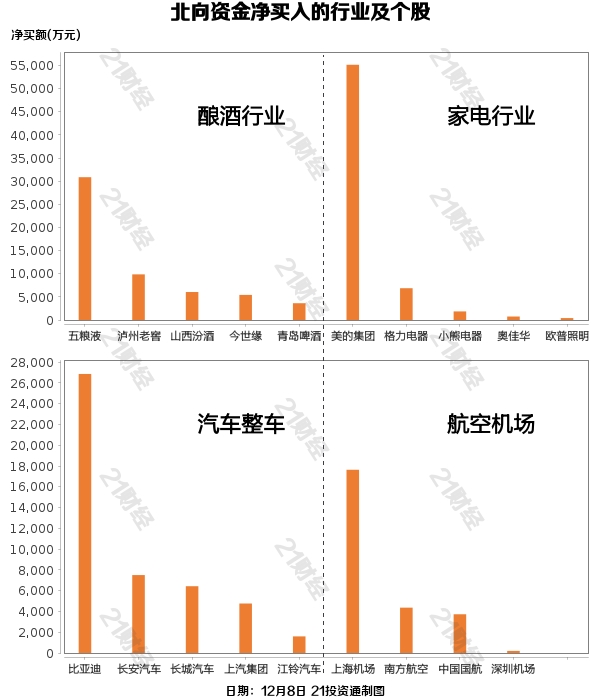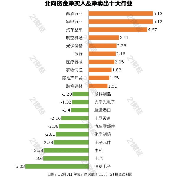 从净买入金额来看,北向资金增持了42个行业,其中酿酒行业居首,净买入金额达5.13亿元,其次是家电行业,净买入5.12亿元。