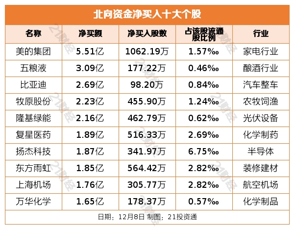 个股方面,北向资金净买入美的集团(000333.SZ)、五粮液(000858.SZ)、比亚迪(002594.SZ)、牧原股份(002714.SZ)、隆基绿能(601012.SH)居前,其中,美的集团被净买入5.51亿元,五粮液被净买入3.09亿元,比亚迪被净买入2.69亿元,牧原股份被净买入2.23亿元,隆基绿能被净买入2.16亿元。