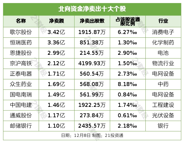 北向资金净卖出歌尔股份(002241.SZ)、恒瑞医药(600276.SH)、恩捷股份(002812.SZ)、京沪高铁(601816.SH)、正泰电器(601877.SH)居前,其中,歌尔股份被净卖出3.42亿元,恒瑞医药被净卖出3.36亿元,恩捷股份被净卖出2.99亿元,京沪高铁被净卖出2.12亿元,正泰电器被净卖出1.71亿元。
