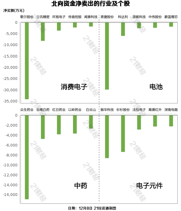 北向资金减持了58个行业,其中消费电子最多,净卖出金额达5.03亿元,其次是电池行业,净卖出3.6亿元。