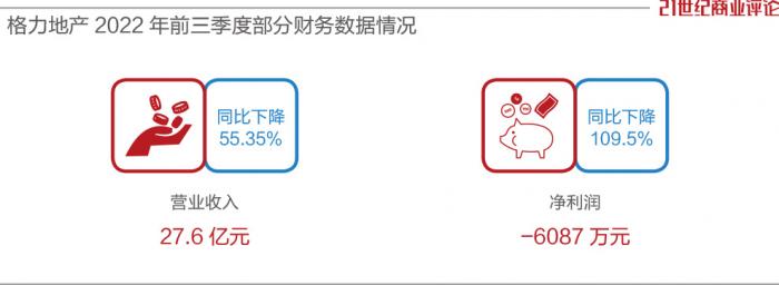 主业收缩、新业未起,必然业绩下滑。2022年前三季度,格力地产的收入同比下降55.35%至27.6亿元,净利润同比下降109.5%,亏损6087万元,这也是其15年来首次亏损。