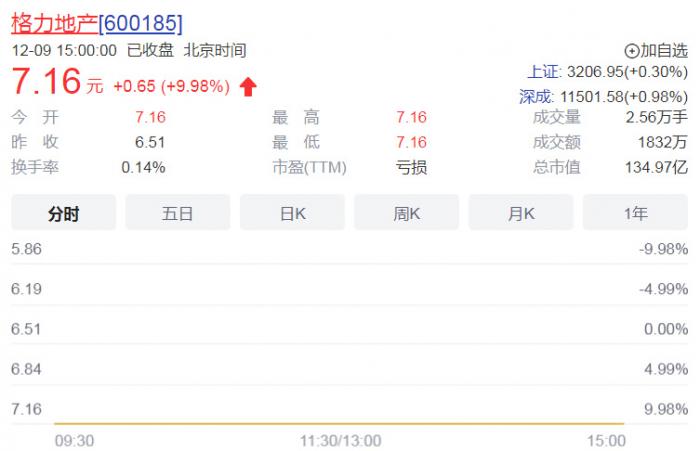 12月9日,停牌四天的格力地产,开盘即一字涨停。