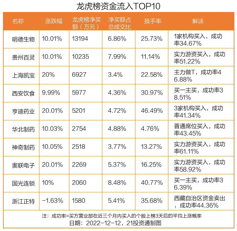 12月12日,上证指数下跌0.87%,深证成指下跌0.89%,创业板指下跌0.79%。盘后龙虎榜数据显示,共有42只个股因当日异动登上龙虎榜,资金净流入最多的是明德生物(002932.SZ),达1.32亿元。