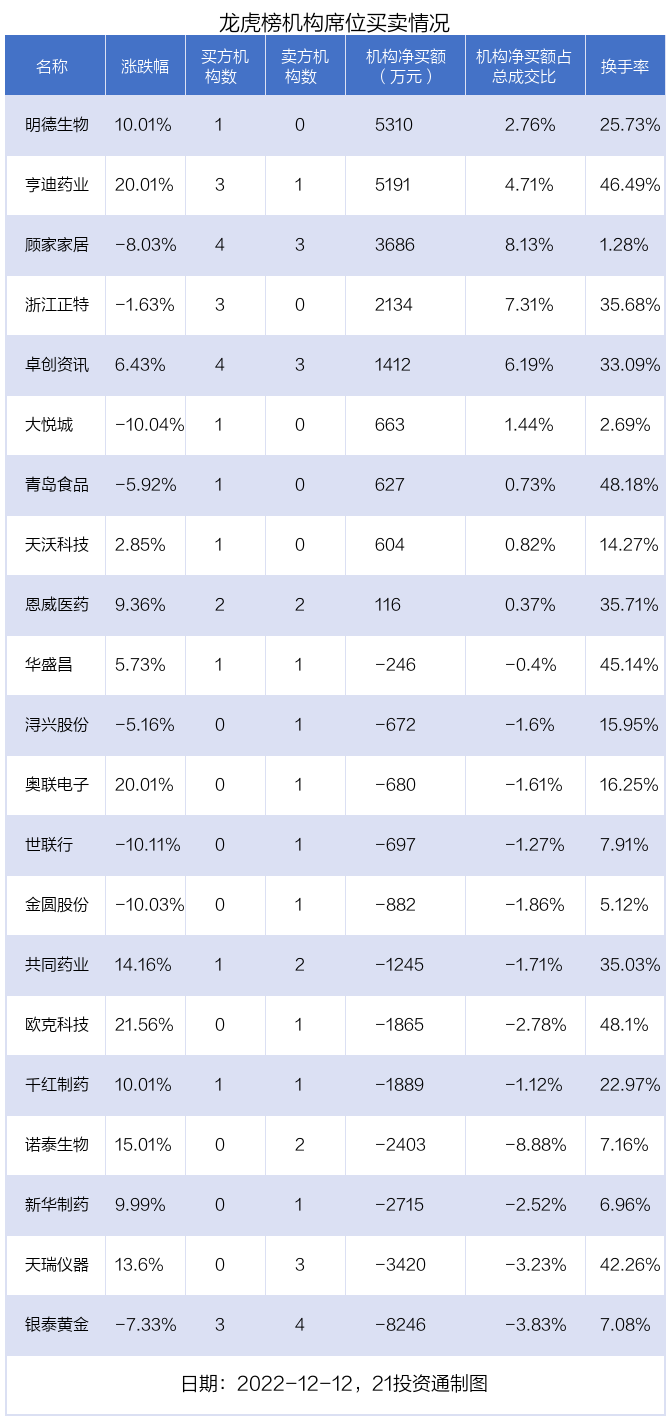 12月12日,21只个股龙虎榜出现了机构的身影,机构合计净卖出5217.13万元。具体来看,机构净买入9股,净卖出12股。