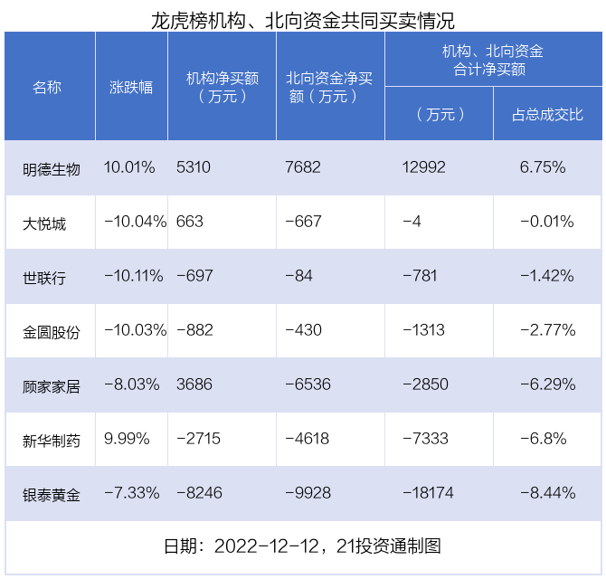 值得注意的是,机构和北向资金共同净买入了明德生物;共同净卖出了世联行、金圆股份、新华制药等4股;在大悦城,顾家家居上出现分歧,机构净买入大悦城662.86万元,北向资金净卖出667.13万元;机构净买入顾家家居3686.09万元,北向资金净卖出6536.31万元。