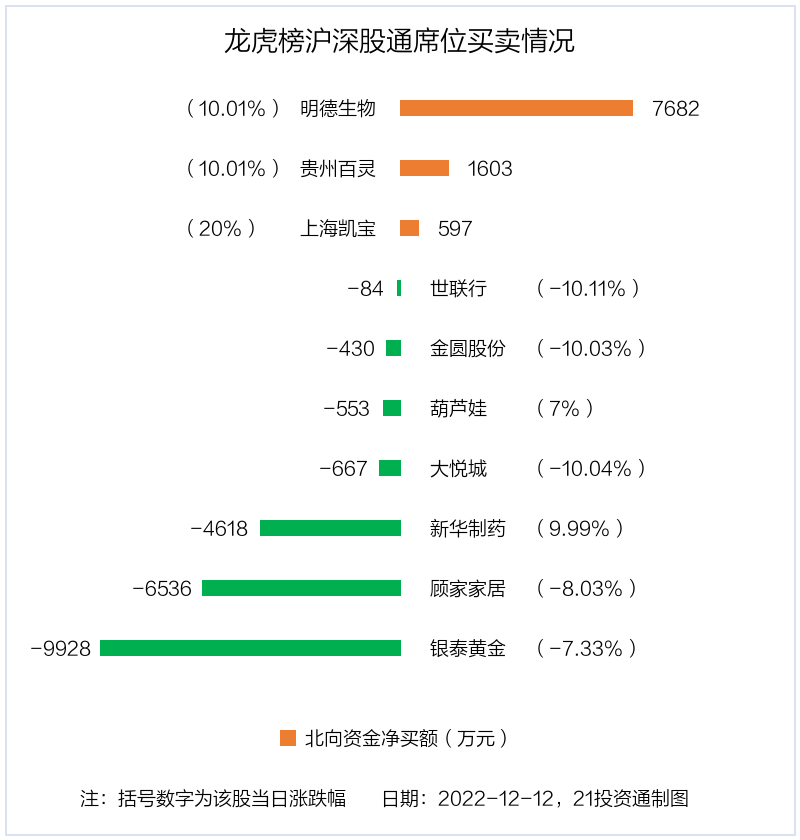12月12日,北向资金参与龙虎榜中的个股共有10只,合计净卖出1.29亿元。其中沪股通净卖出2 股,合计净卖出7089.56万元;深股通净买入3 股,净卖出5 股,合计净卖出5846.06万元。