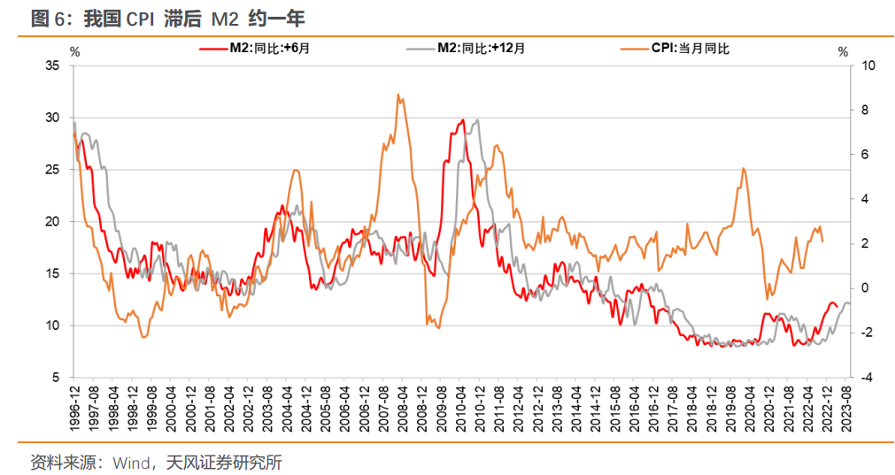 货币扩张传导到物价上涨存在时滞,但广义货币扩张最终大多会传导到 CPI 上涨。从历史观察,M2扩张传导至CPI上涨的时滞约在半年到一年左右。