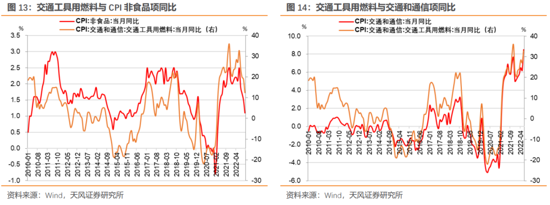 交通通信是CPI分项中唯一一个权重占比高且价格波动大的非食品分项。