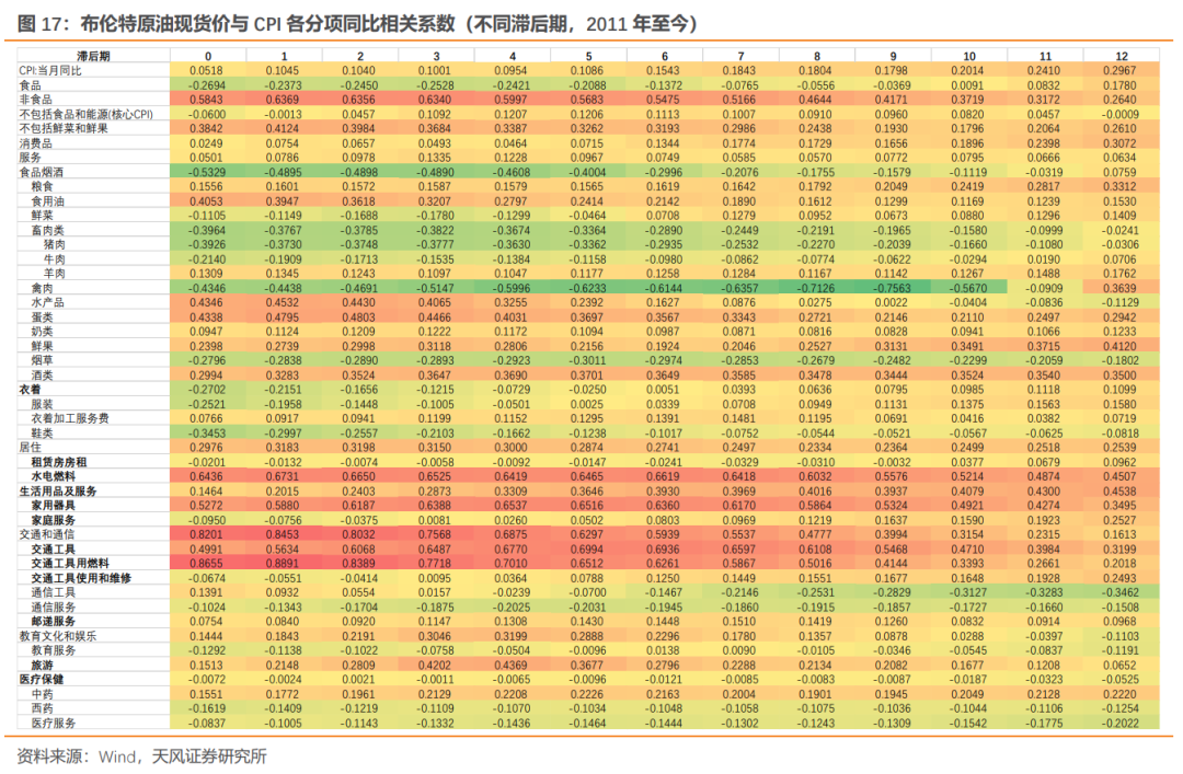 观察2011年以来的相关系数显示,国际油价变化对交通工具燃料、水电燃料的传导最为顺畅,而对粮食、鲜菜以及其他服务类价格的影响似乎并不明显。同时注意到油价的影响主要是即期的,随着时间推移影响逐步减弱。可以看到,油价变动至少对于燃料分项的传导是最为直接的。