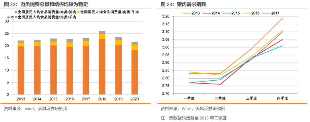 聚焦到年内短期视角来看,猪肉需求呈现较强的季节性,一二季度猪肉需求较低,而三季度和四季度的两个双节的猪肉备货以及腌腊需求旺盛,带动猪肉需求增加。
