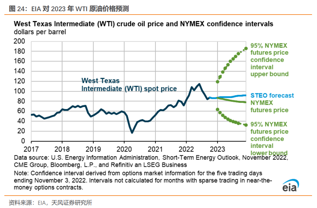 在不发生大规模地缘政治冲突以及海外景气度持续下行的背景下,我们预计以原油为主的外因定价商品大幅上涨的可能性不大,2023年油价整体可能呈现前低后高,全年均值低于今年,年底价格约90-95美元/桶。