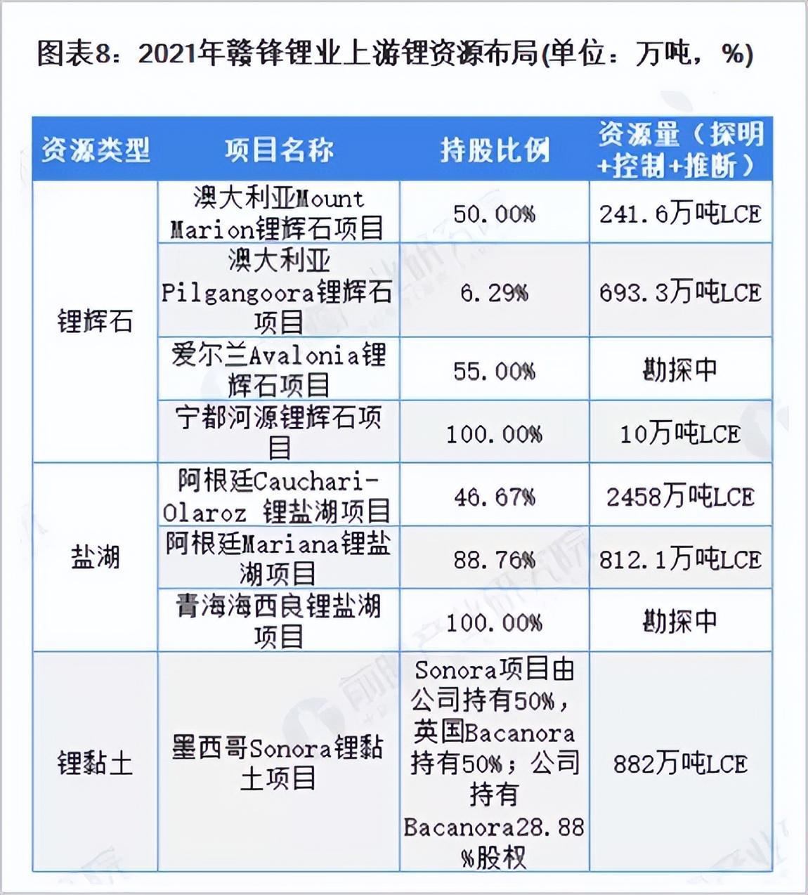在盐湖资源方面,赣锋投资了阿根廷Cauchari-Olaroz锂盐湖项目、阿根廷Mariana锂盐湖项目和青海海西良锂盐湖项目,盐湖的锂资源储量合计能生产3000多万吨碳酸锂。