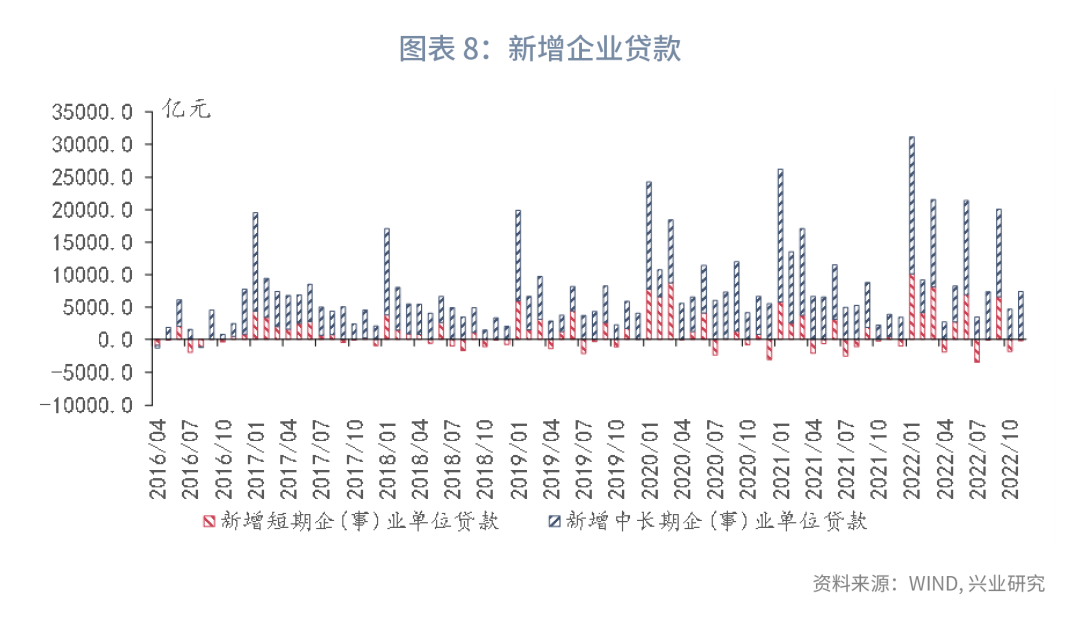 从企业贷款来看,设备更新改造再贷款和保交楼专项借款持续发挥作用,带动企业贷款增长。11月24日,银保监会相关负责人表示,“保交楼”专项借款已基本投放至项目,专项借款资金也为企业中长期贷款提供支撑。11月新增企业贷款8837亿元,同比多增3158亿元。其中,短期、中长期新增贷款分别为-247亿元、7367亿元,同比分别变动-65亿元、3950亿元。
