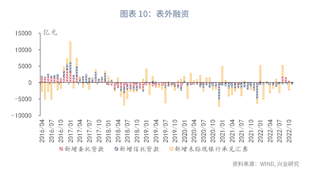 从表外融资来看,11月仅未贴现票据规模小幅增加。11月未贴现票据融资规模为190亿,较上月增加2347亿。11月新增委托贷款以及信托贷款均小幅减少,分别录得-88亿元以及-365亿元。