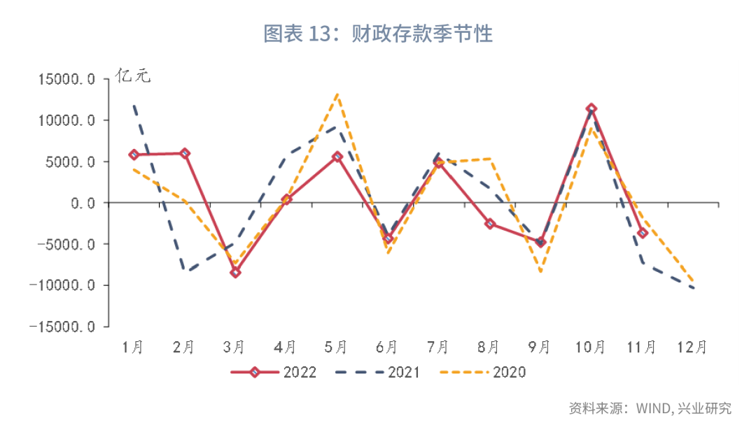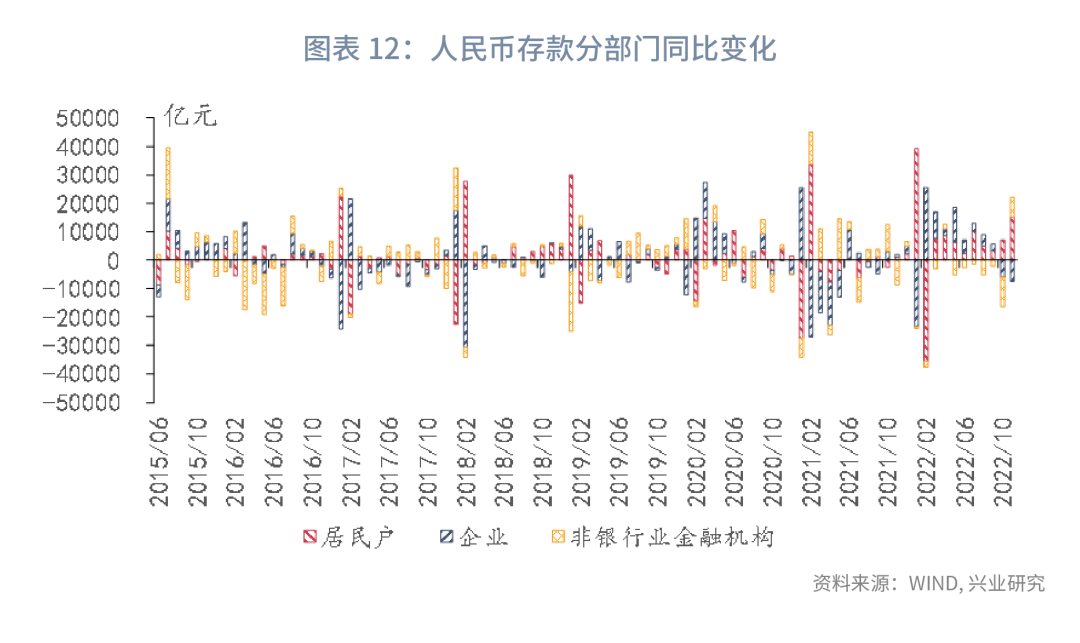 M2方面,11月M2同比反弹至12.4%,较上月提升0.6个百分点。新增人民币存款分部门来看,仅居民存款同比继续上行,企业以及非银存款同比均回落。因此,M2的反弹的主要原因是居民存款同比的大幅提升。11月新增居民存款22500亿元,同比多增15192亿元。11月疫情全国扩散范围广,疫情不确定的提升导致居民预防性储蓄的增加,带动M2上行。
