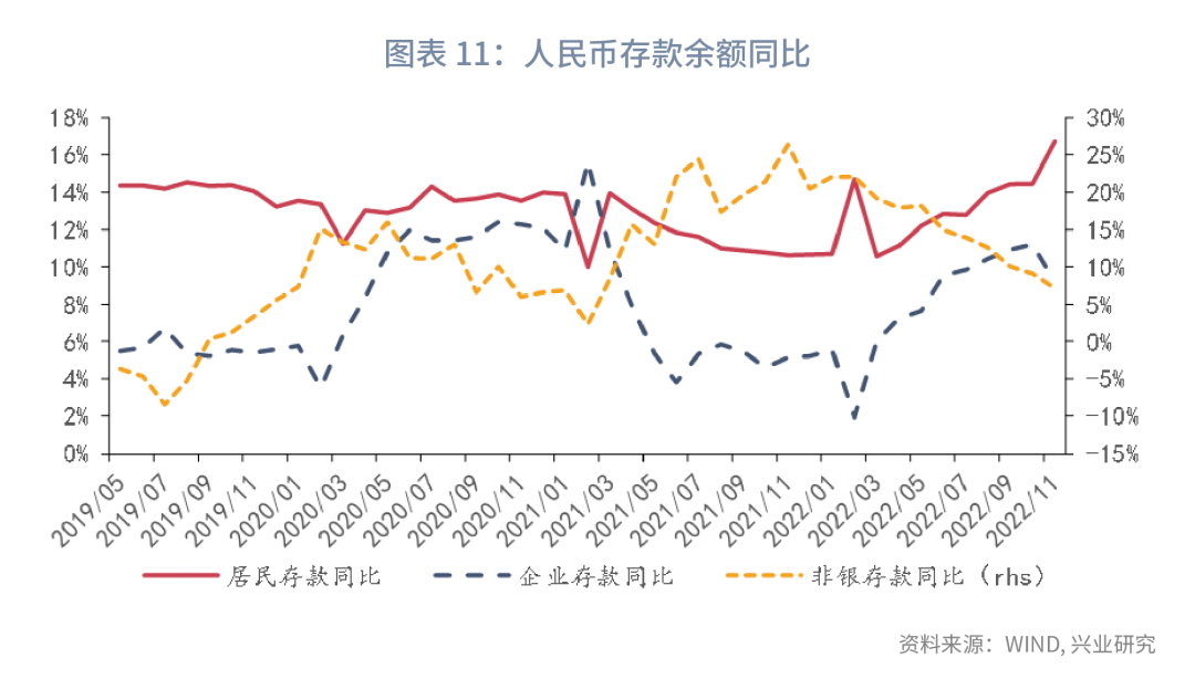不过,企业贷款在设备更新改造再贷款以及“保交楼”专项借款的作用下维持多增。M1方面,房地产销售低迷导致M1同比继续下行。M2方面,11月疫情波及面较广,居民预防性储蓄需求上升较快,M2同比显著反弹,但企业以及非银存款同比均有所回落。