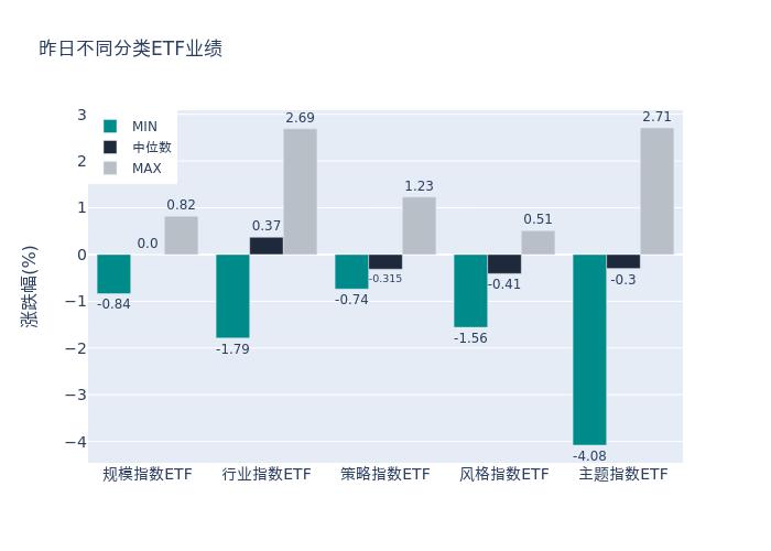 昨日股票型ETF收益率中位数为-0.19%。其中按照不同分类,规模指数中A50ETF收益率最高,为0.82%;行业指数中建信中证饮料主题ETF收益率最高,为2.69%;策略指数中红利ETF收益率最高,为1.23%;风格指数中招商中证银行AH价格优选ETF收益率最高,为0.51%;主题指数中酒ETF收益率最高,为2.71%。