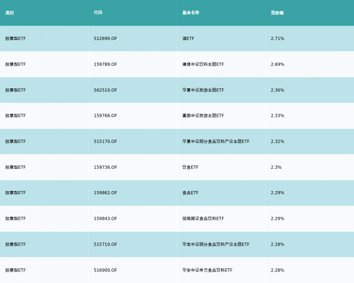 昨日股票型ETF涨幅最高的3支ETF及其收益率分别为:酒ETF(2.71%)、建信中证饮料主题ETF(2.69%)、华夏中证旅游主题ETF(2.36%)。涨幅前10详情见下表: