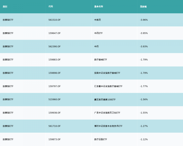昨日股票型ETF跌幅最大的3支ETF及其收益率分别为:中医药(-3.96%)、中药ETF(-3.95%)、中药(-3.93%)。跌幅前10详情见下表:
